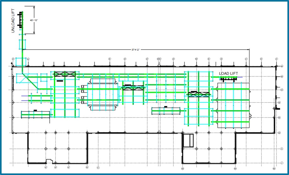 A supplier of air movement and control equipment needed a conveyor system for their new building. Requirements included a maximum carrier weight of 1200 lbs. and a lift with a long stroke of 13’ 3” and access from the back side of the lift. Budget constraints required a system that could be easily modified in the future to add more functionality.