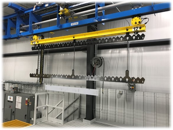 IntelliTrak designed, manufactured and installed the 1500 Series overhead conveyor with a 36’6” load bar and a double trolley carrier. To efficiently move the over-sized load bar in the narrow floor space, IntelliTrak installed 3 shuttle assemblies that fed into 20 shuttle stop assemblies and an empty carrier return lane (saving floor space and construction costs). The added functionality of the forward/reverse ability of the IntelliTrak system improved the overall process. And the solution for lifting a 36’ load bar? A custom-designed double split-cantilever lift with a single drive shaft. Problem solved.